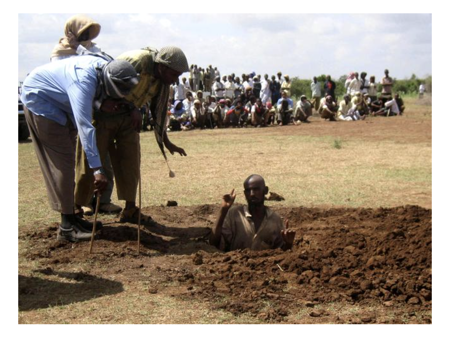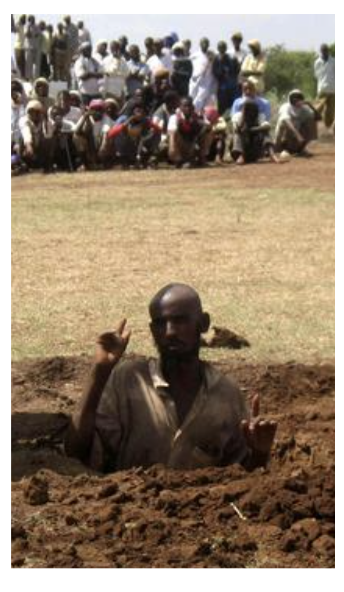 (AP Photo/Farah Abdi Warsameh), (detail) Mohamed Abukar Ibrahim, 48, is buried in the ground before he was stoned to death by militants from the Hizb Al-Islam group in the Afgoye district of Lower Shabelle province in Somalia, Sunday, December 13, 2009. A local Islamist court sentenced the victim to death by stoning after he was found guilty of committing adultery with a 15-year-old girl while he was married. The execution was witnessed by hundreds of people.