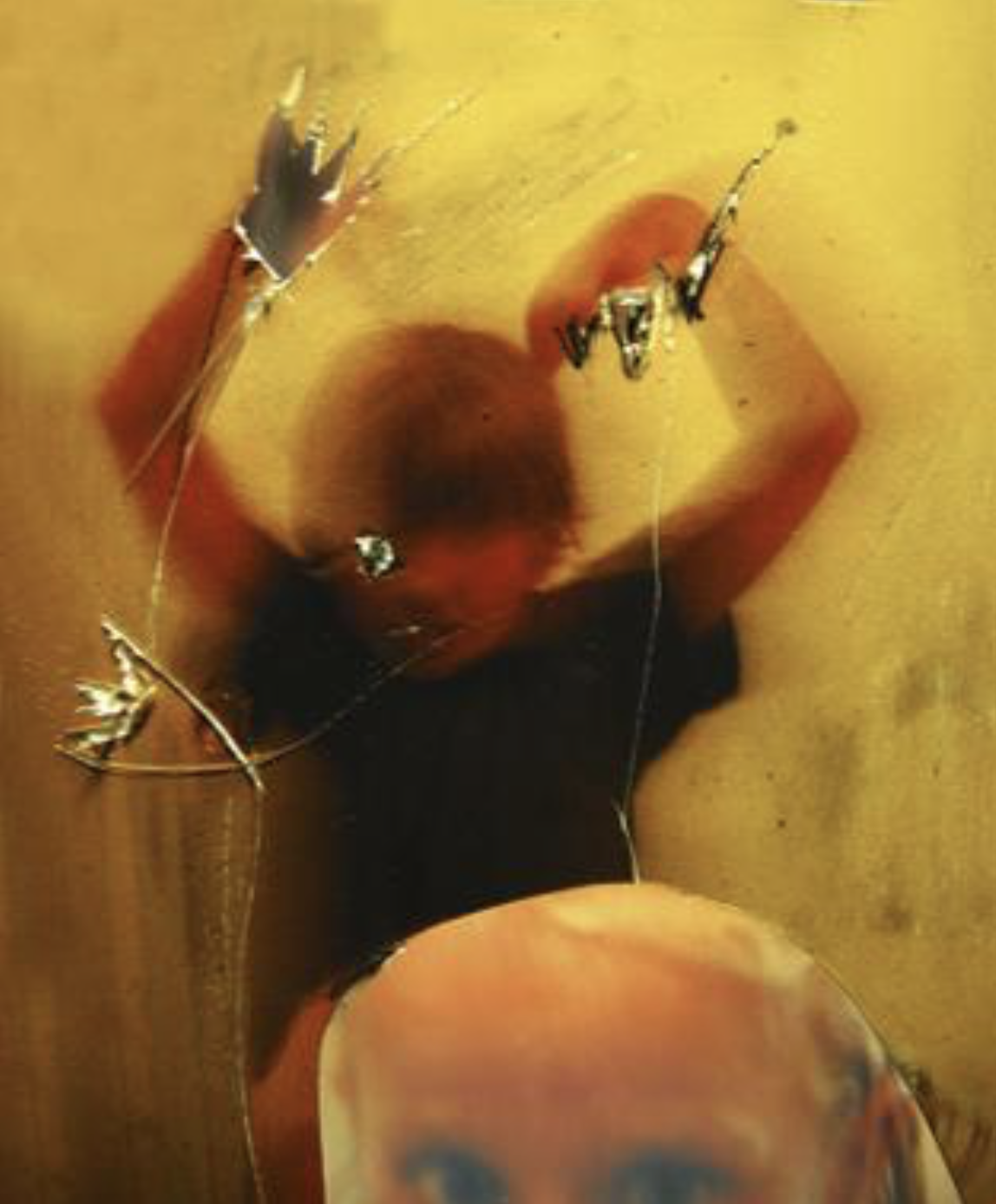 The piece has a direct link to the yellow portrait above: two figures facing the viewer, with one as a seeming off-stage controller of the central figure, and with Gerald’s characteristic interventions of cutting and drawing.
